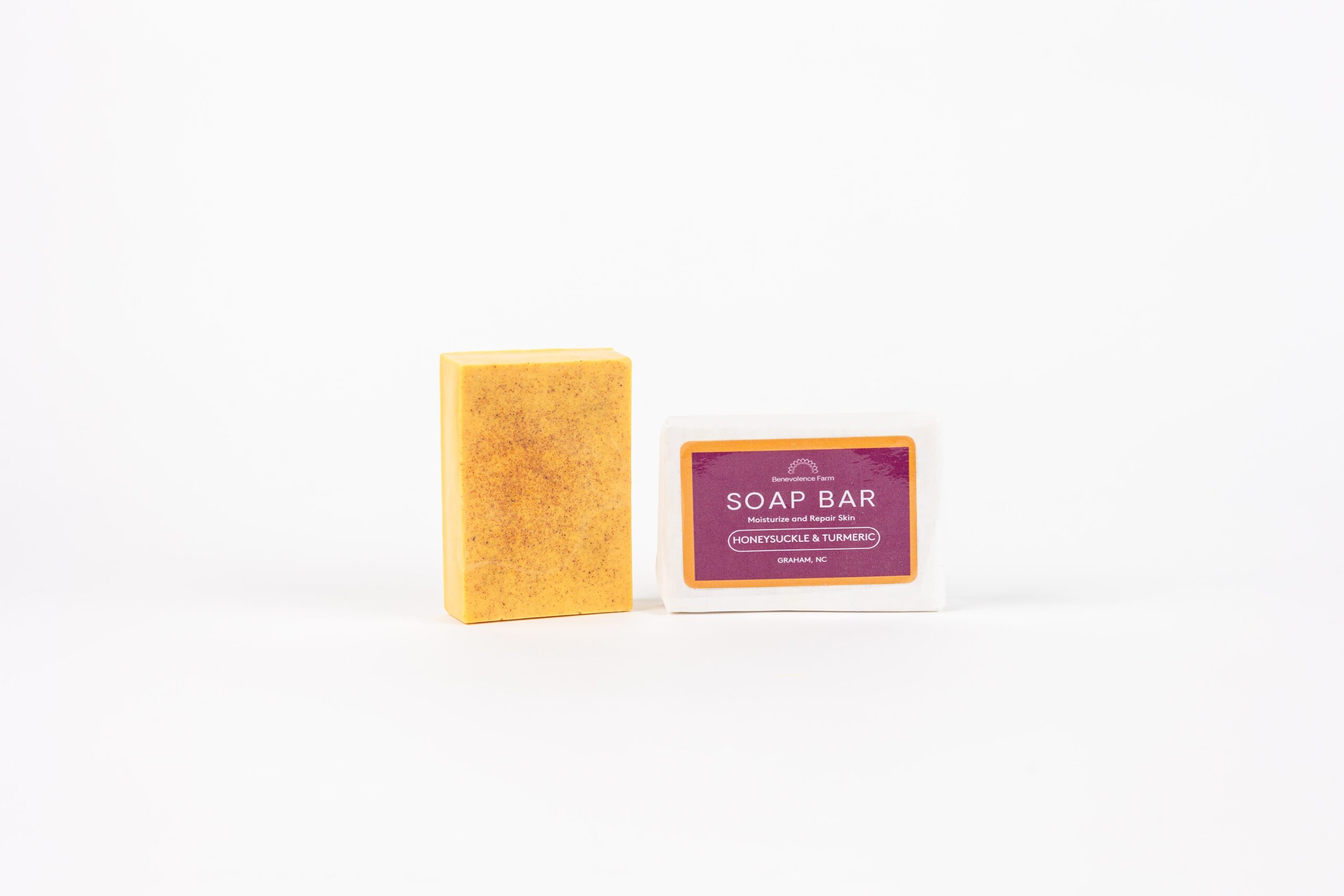 Ingredients: Lemon balm and chamomile infused oil, turmeric, honey, honeysuckle fragrance oil, and goat’s milk soap base.